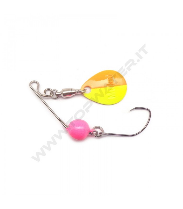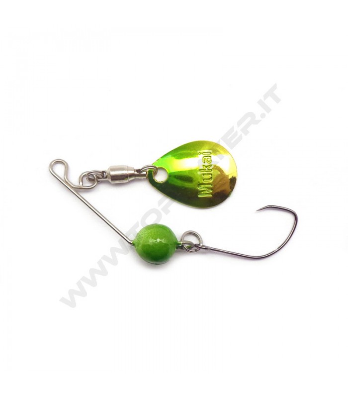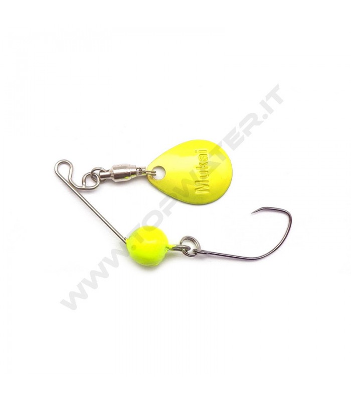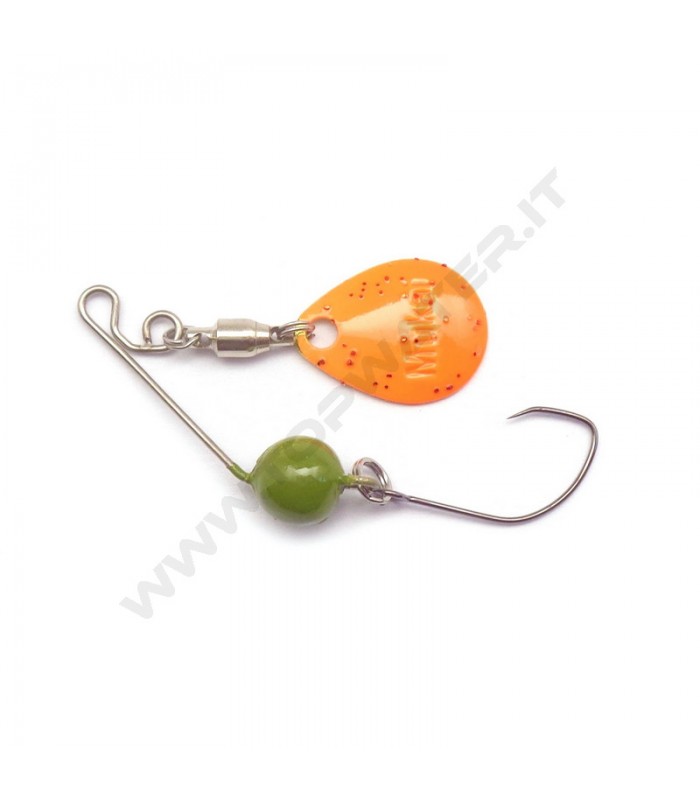 Mukai B-Ball è un piccolissimo spinner bait ideato appositamente per il trout area di appena 30mm di lunghezza e 2.8g di peso. La piccolissima paletta è montata su girella con cuscinetto a sfera in modo da girare alla minima trazione, inoltre la posizione dell'amo che rimane appena dietro la paletta è perfetta per favorire la corretta allamata.