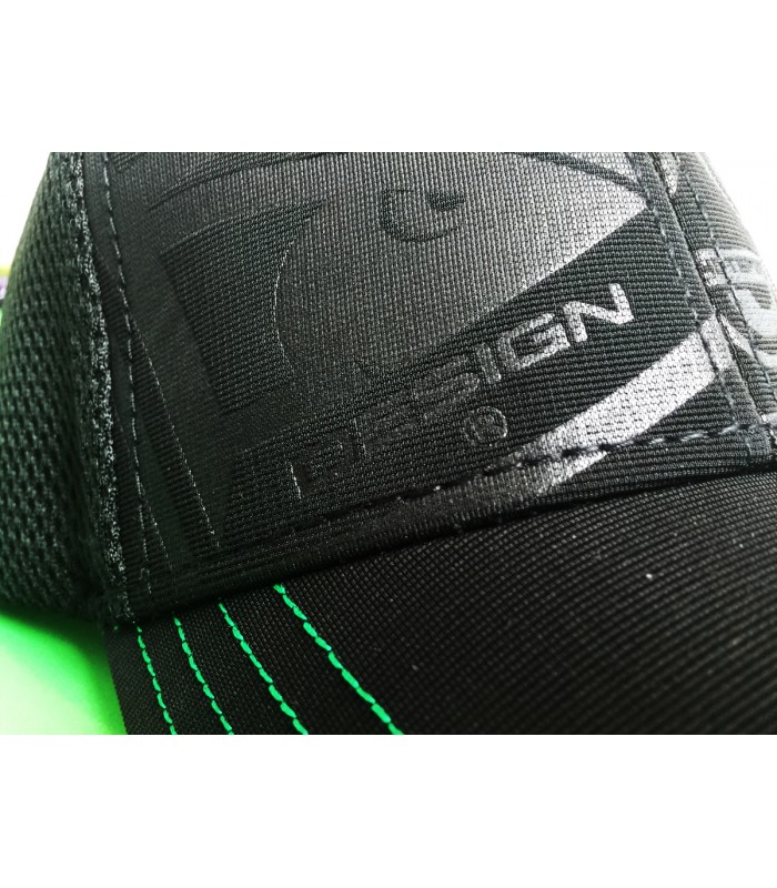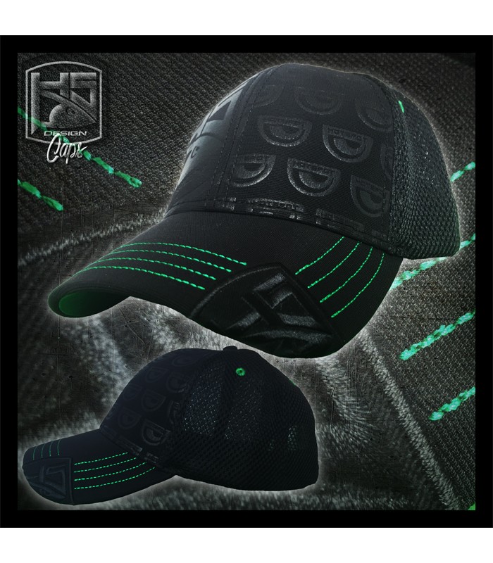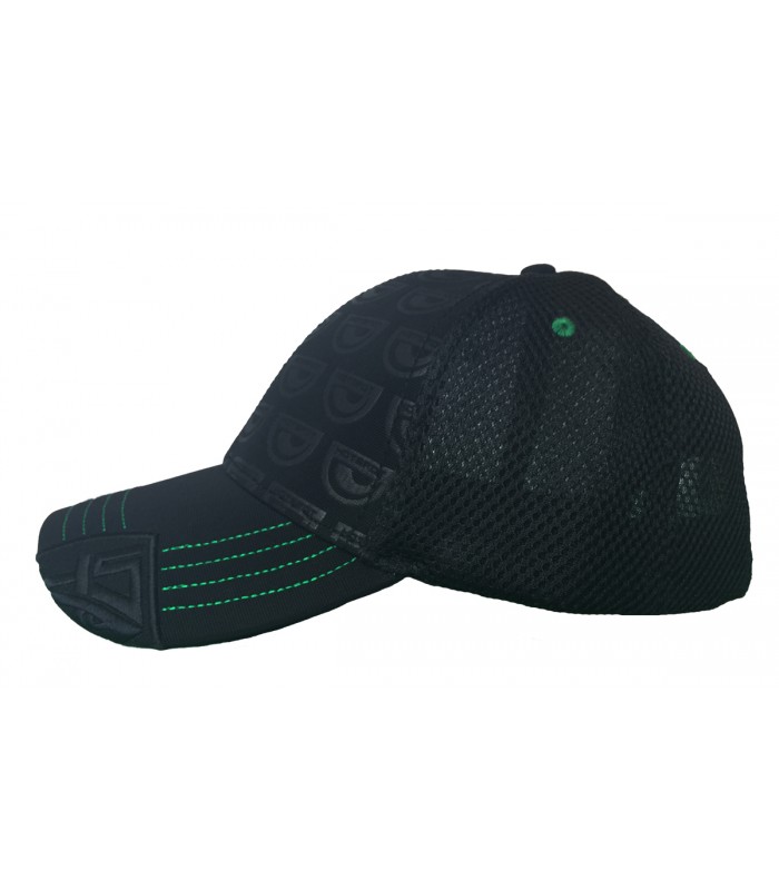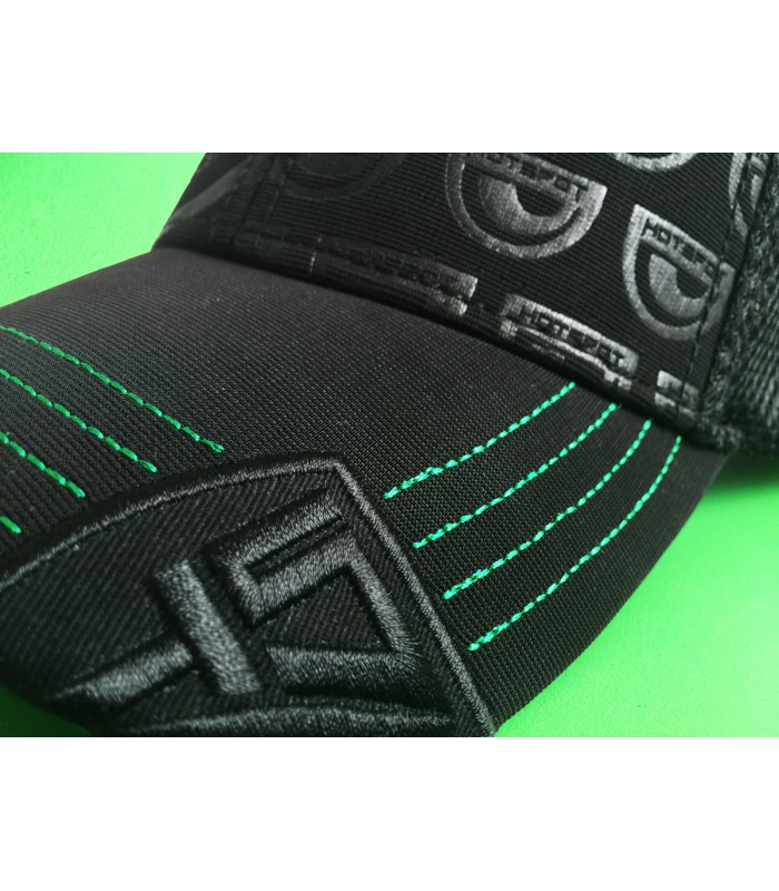 Sulla visiera abbiamo con grandi linee di cucitura in colore a contrasto (verde), sul lato sinistro una parte del logo HS è ricamata sul bordo.