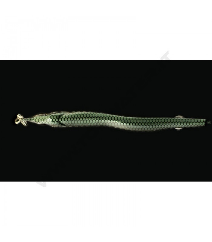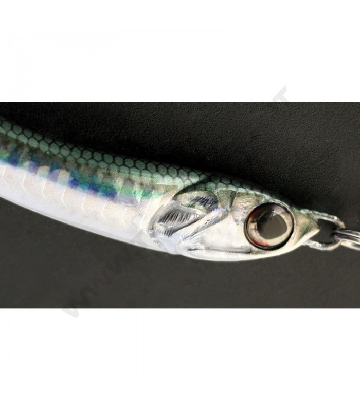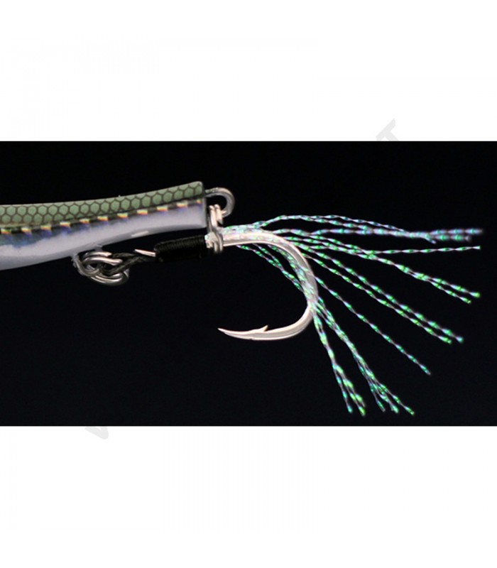 L'altra articolarità di questo metal jig è l'amo posteriore che oltre ad essere ornato di fibre olografiche è tenuto in posizione da un geniale sistema che sfrutta un doppio occhiello. Questa caratteristica permette ferrate sicure che vanno praticamente sempre a buon fine.
