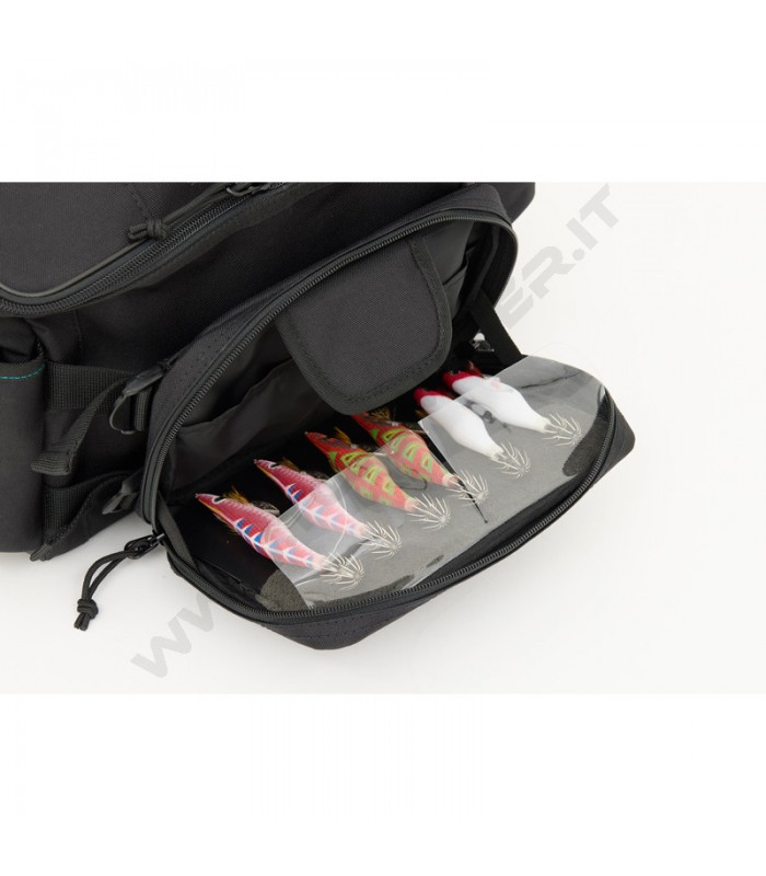 Il vano rimovibile ed è posto sulla parte anteriore della borsa, al suo interno è dotato di un porta egi rimovibile fissato con velcro, inoltre questo è dotato di una pratica apertura a vassoio che può essere richiusa con zip o con apertura rapida a velcro da utilizzare quando si è in pesca per un rapido accesso alle totanare più utilizzate.
