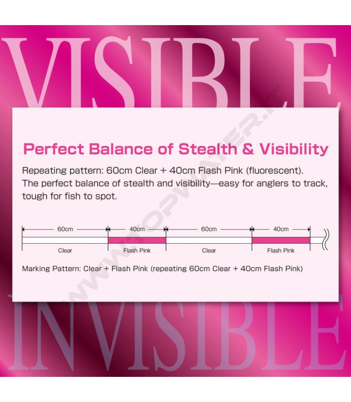 Visibilità Totale: Il sistema di marcatura alternata (Marking) 60cm Clear + 40cm Flash Pink (fluorescent) permette di individuare la lenza in ogni condizione di luce e contro qualsiasi sfondo (rocce, schiuma, vegetazione). Fondamentale per seguire la traiettoria dell'artificiale e avvertire le mangiate "visive".